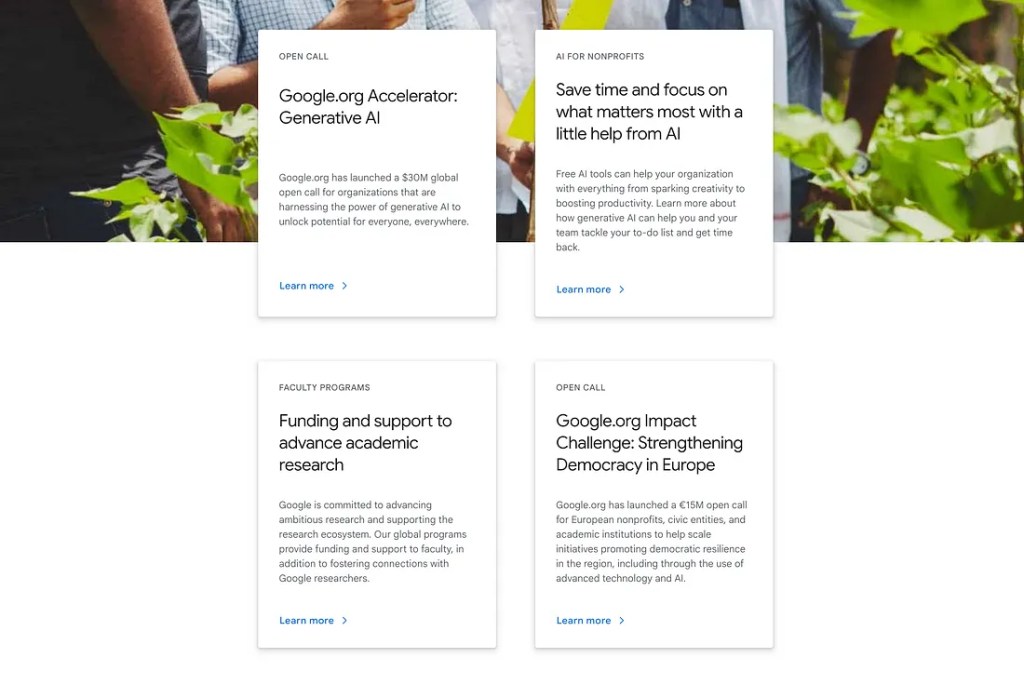 A Google.org szervezet is kínál lehetőségeket akcelerátorprogramokon keresztül. Bár jelenleg a legtöbb ilyen program nemrégiben lezárult, mindenképp érdemes figyelemmel kísérni őket, mivel kiváló lehetőséget jelentenek a társadalmi hatásra törekvő startupok számára.