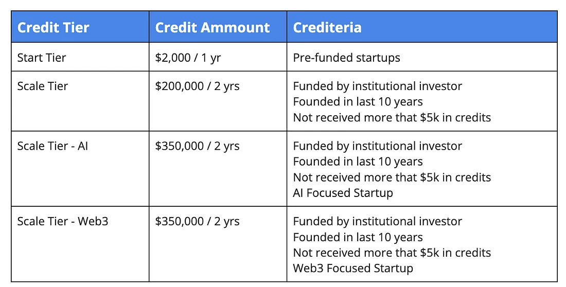 A Google számos olyan programot kínál, amelyek célja, hogy támogassa a különböző fázisban lévő startupokat, hozzáférést biztosítva a technológiához, a közösséghez, az erőforrásokhoz és a szakértői útmutatáshoz, hogy segítse őket az építkezésben és a méretnövelésben. Ezek a programok 2000 és 350 000 dollár közötti Google Cloud startup krediteket kínálnak, hozzáférést a Google STOA modelljeihez, és a legjobbat a végére tartogatva hozzáférést egy tapasztalt felhőmérnökhöz.