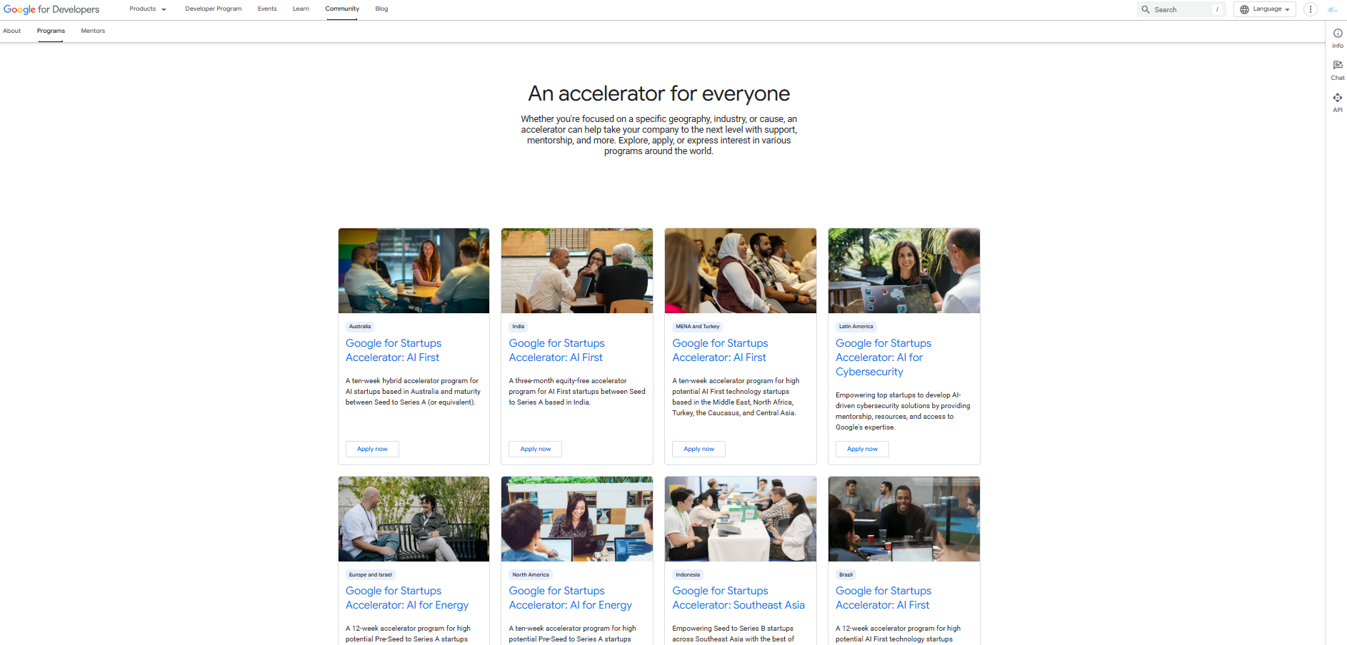 A Developers weboldal programkönyvtára ugyanazokat az akcelerátorprogramokat tartalmazza, mint a startup.oldal, de emellett társadalmi hatású kezdeményezéseket is felsorol. Ilyenek például azok az akcelerátorok, amelyek fekete, latinó és női alapítók támogatására fókuszálnak.
