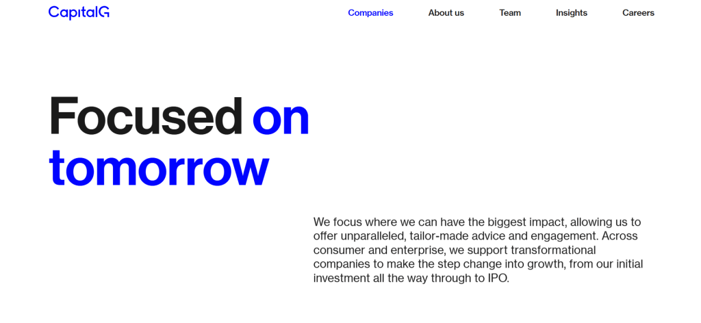 A CapitalG profitorientált befektetéseket hajt végre, és portfóliócégeinek hozzáférést biztosít a Google szakértelméhez olyan területeken, mint az adatelemzés, mérnöki fejlesztés, marketing és termékmenedzsment – ezzel is támogatva növekedésüket.